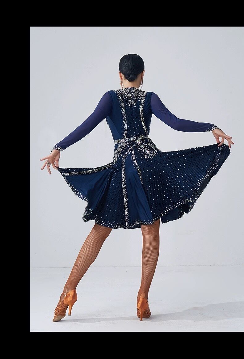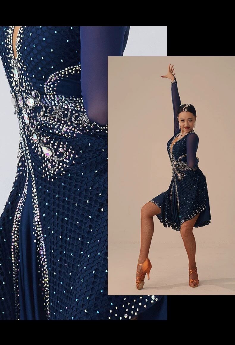 新品 ほぼオーダーメイドに近い豪華な社交ダンスドレス衣装。ウェスト、ヒップ、丈、袖の長さなど無料カスタマイズできます